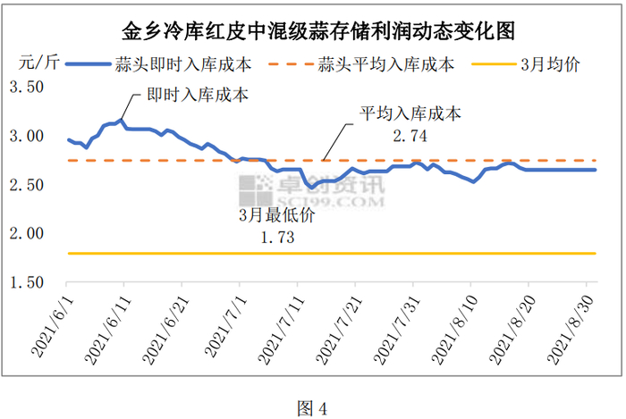 2021年夏季入库的大蒜平均成本2.74元/斤,在不增加折秤损耗的情况下,3月份最低价格出现时,冷库蒜存储商平均亏损达到1.01元/斤。存储商抗价情绪出现,优质好品质货源卖家惜售观望情绪加重。个别看好后市行情的炒货商家开始试探性进场接货,冷库蒜市场交易氛围由弱趋稳。