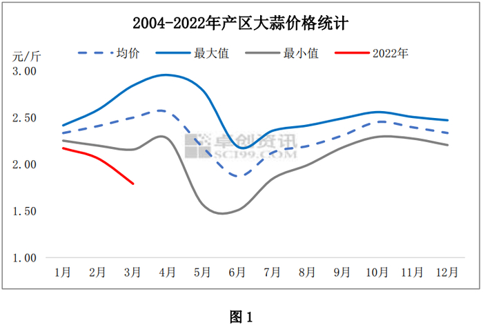 大蒜是一季产新全年消费的产品,商品蒜主产地分布于山东、河南、河北、江苏及云南。云南大蒜主要供应2-4月份国内市场鲜食蒜头需求;北方商品蒜4-5月份产新,6-8月份入库存储,冷库蒜可供应到次年新蒜上市。正常情况下,4-5月份新蒜上市之前,青黄不接的一季度随供需关系收窄蒜价呈现上涨趋势。2022年一季度冷库蒜价格一改常态持续下跌,主因供过于求矛盾突出,冷库蒜存储商销售压力逐步增强。