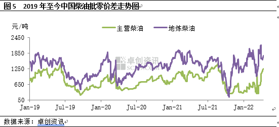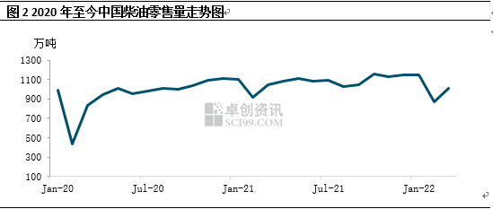 柴油消费结构相对复杂,但是仍然是通过加油站或者加油车加注到指定的汽车、机器或储罐才完成消费环节。所以,柴油零售量走势仍然可以代表具体的消费情况。从图2可以看出,2022年国内柴油零售量先跌后涨。据卓创资讯数据统计,2022年3月,中国柴油零售量在1006万吨左右,同比上涨21%,环比上涨15.41%。当然,这并不能完全代表柴油需求处于迅速回升状态,更多的原因是二月份处春节假期期间,且3月份较2月份多3个自然日。