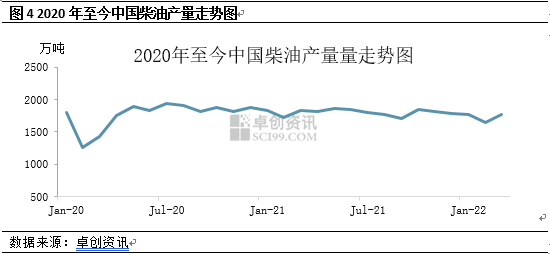 据卓创资讯数据统计,2022年3月份,中国柴油产量在1764万吨左右,同比上涨23%,环比上涨7.55%,整体供应较为充足。同时,2022年1-2月份,柴油累计出口量为42万吨,累计同比下跌87.8%。与汽油相同,即便后期通过增加出口转移一定的供应压力,但因出口配额有限,故对于缓解柴油供需矛盾压力作用较小。