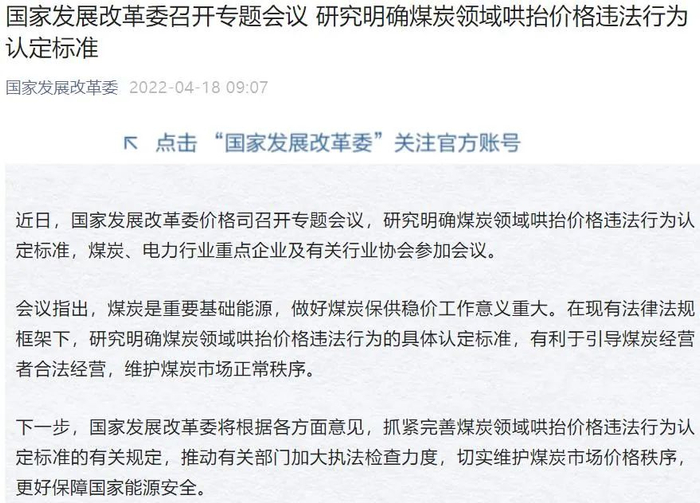 国家发展改革委官微4月18日发布消息:近日,国家发展改革委价格司召开专题会议,研究明确煤炭领域哄抬价格违法行为认定标准,煤炭、电力行业重点企业及有关行业协会参加会议。