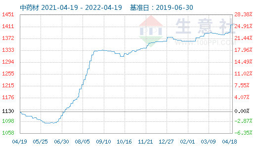 4月18日中药材指数为1418点,与昨日持平,创下周期内的历史新高,较2019年11月25日最低点975点上涨了45.44%。(注:周期指2019-06-30至今)