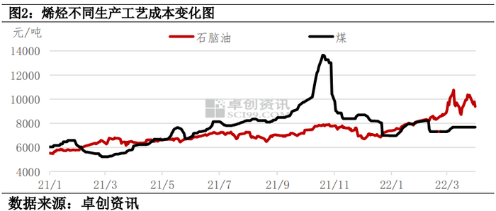烯烃是重要的化工原料,以烯烃为例,比较原油和煤炭两条生产路径的成本。从图2中可以发现,2021年12月份,原油价格超过80美元/桶后,煤制烯烃和原油工艺制烯烃的价差开始缩减,当原油价格在2月8日超90美元/桶以后,石油化工的成本超过煤化工,并随着原油价格的变化,差距逐渐增大。从2021年12月份开始,国家多次发布保供稳价政策,今年国家各项保供稳价政策得以延续,煤炭价格保持在较合理水平,因此一季度煤制烯烃的平均成本仅有7596元/吨,显著低于其他生产工艺。