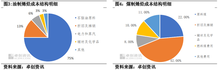 究其原因,在于两种工艺中,原料成本占成本总和的比例有所不同。从图3可以看出,油制烯烃项目75%的成本在于原料,因此对油价敏感,当油价大幅度上升时,成本总和对于原油价格十分敏感,并且难以从其他方面控制总成本。从图4可以看出,煤制烯烃中原料煤所占成本总和的比例为22%,远小于油制工艺中原料成本占成本总和的比例。因此,当前期固定资产建设投入完成后,由于原料煤成本占成本总和的比例较小,自有煤炭资源的企业较容易压缩成本,成本优势凸显。