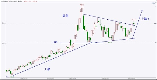 原油的支撑是很明显的,600元一桶是重要的市场心理关口。前期受俄乌战争对国际原油供给的影响,使得价格一路上涨至805元一桶,在俄乌战争前景没有十分明朗的前提下,价格想要再次回到600元以下,是得不到市场认可的。因此,如果价格后市测试600元附近的支撑区,是非常合适的买入机会。当下应观察600附近小周期上形成的局部底部形态,为日线做多提供支持。