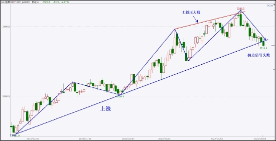 焦煤的走势还是有迹可循的,之前一直保持着良好的上涨趋势,在连续创出新高后,出现衰竭现象,并且受到上斜压力的阻挡,开始了临近的这波下跌。但目前来看,还只能作为次级折返下跌,并没有破坏近几个月的上涨节奏。另外,下跌段弱势趋近上涨趋势线,且呈现出震荡下跌的格局,要观察震荡的突破方向,并评估上涨趋势线的支撑力度,进而判断日线上局部更高低点的确认。