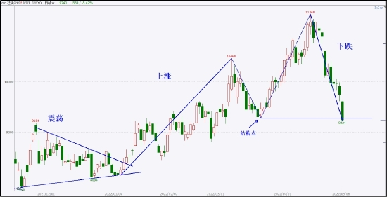 观察硅铁的走势结构,有两点需要说下。一是,上涨是从震荡中衍生的,震荡的时间和上涨的时间之间相互影响,具体时空比例需要具体分析。二是,价格在创出11340的高点后的下跌段,越过了上涨趋势的关键结构点,对前期上涨趋势有终结作用,这个在趋势逻辑上非常常见。以上两点在大量的图形案例中都能得到体现,感兴趣的可以复盘琢磨。