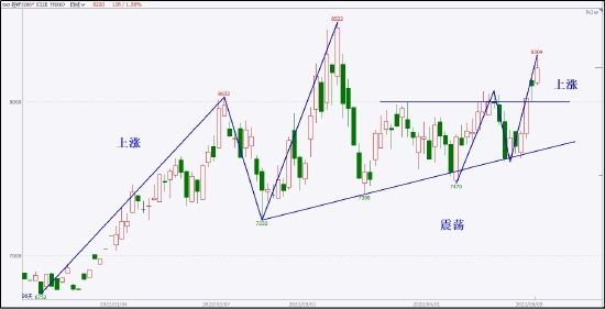 当下价格形成了局部的上涨节奏,并且突破窄幅三角震荡的上轨压力,上涨动能强大。后市继续跟随多头趋势进行操作即可,保守的话在小周期上看到明显的调整后再考虑跟随。另外,越是逼近前高8522的时候,多头越要谨慎。暂时不考虑空头思路,因为没有日线看空支撑。
