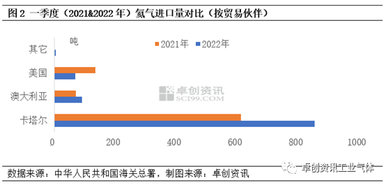 按贸易伙伴来看,一季度(2021&2022年)氦气进口量主要来自卡塔尔、美国、澳大利亚以及其它欧洲国家。2022年一季度卡塔尔进口量854.39吨,同比增长39%,占到一季度总供应量的84%,随着卡塔尔三期1200万立方米氦气产能投产,当地供应量增强。2022年一季度美国进口量67.75吨,同比减少50%,主要是2-3月美国BLM装置运行不稳以及进口均价高企等因素所影响,从而增加了对周边国家的进口量。2022年一季度澳大利亚进口量达到91.03吨,同比增长31%。