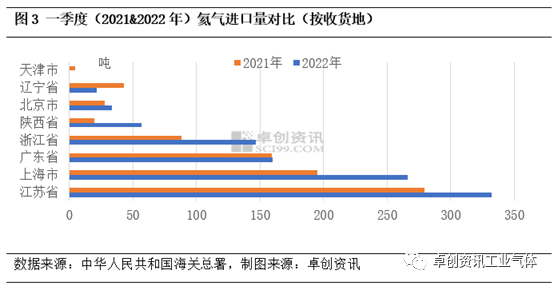 按收货地来看,一季度(2021&2022年)氦气进口主要收货地是江苏省、上海市、广东省以及浙江省,这四省占到总进口量的89%。另外,陕西省、北京市、辽宁省以及天津市还有少量进口。2022年一季度江苏省共进口氦气332吨,同比增长18.74%,排名第一,占总进口量的33%。2022年一季度上海市共进口氦气266吨,同比增长36.47%,广东省共进口160吨,同比增长0.3%,浙江省共进口147吨,同比增长66.78%。