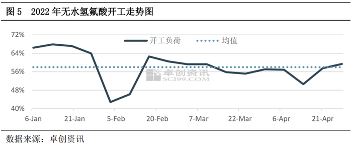4月份以来无水氢氟酸开工5成左右。部分厂家在利润偏低的现状下,降负检修;其次局部地区交通受限,厂家出货不畅,库存压力也促使厂家低负荷运转;同时也有部分厂家原料受限,开工无法提升。在市场环境的作用下,无水氢氟酸局部地区货有偏紧表现。