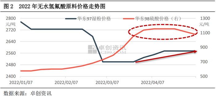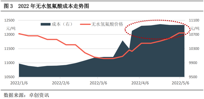 图3显示3月中后旬,无水氢氟酸生产成本居高不下,尤其4月后成本保持在10000元/吨以上,厂家利润压缩明显。据卓创资讯调研显示,此时间段内,由于硫酸价格的高位,江西及福建地区部分生产厂家利润有倒挂的表现,挺价意向的作用下促使无水氢氟酸价格连续两月上涨。