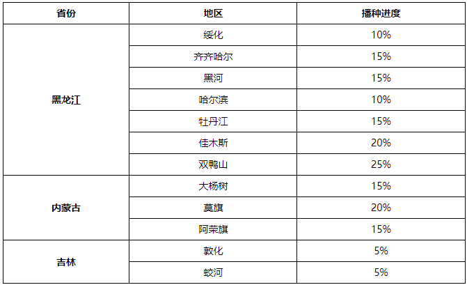 4月下旬东北地区进入春播时期,但由于出现倒春寒的天气,4月中下旬至劳动节期间,东北多数产区雨雪天气,气温偏低。受此影响,东北部分产区的春播工作出现延后。