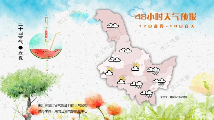 18日夜间到19日白天:黑河南部、伊春、齐齐哈尔、大庆、绥化、哈尔滨、鹤岗、佳木斯、双鸭山、七台河、鸡西、牡丹江多云有阵雨或雷阵雨,其它地区晴有时多云。