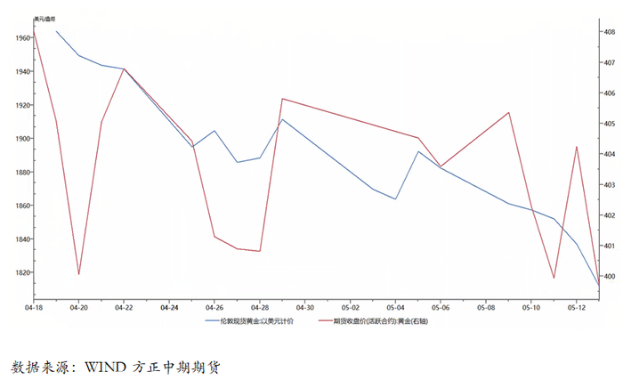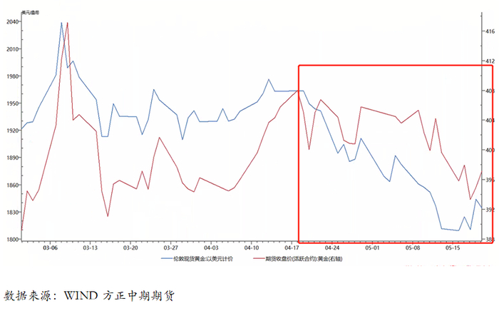 4月18日-5月13日,受美联储货币政策加速收紧和地缘政治局势无进一步恶化的利多出尽影响,黄金承压回落。伦敦金现从1998.39美元/盎司的高位一度跌至1798.8美元/盎司,跌幅达到199.59美元/盎司/9.99%;沪金从408.46元/克的高位跌至399.22元/克,跌幅为9.24元/克、2.26%。沪金表现明显强于伦敦金现表现,内外盘的套利机会亦逐步显现。此阶段,人民币持续贬值,美元/离岸人民币从6.3789持续涨至最高的6.8364,涨幅达到7.17%。伦敦金现是美元计价,而沪金是人民币计价,故美元/离岸人民币的走势使得内外盘黄金行情强弱出现明显的分化。简单来看,伦敦金现的跌幅与沪金跌幅和人民币贬值幅度之和基本相等,这从数据上亦看出人民币的贬值带来了沪金的强势行情。