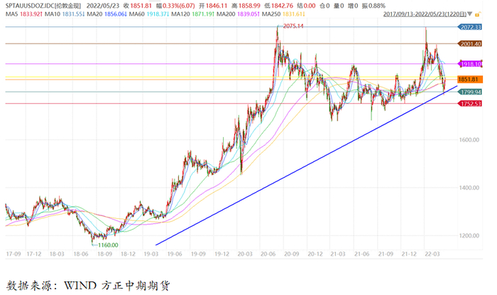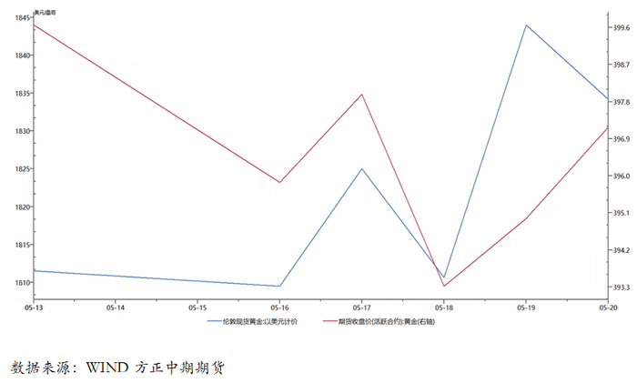 5月16日-5月20日,美联储货币政策加速收紧预期逐步被市场计价,形成利空出尽影响,黄金触底反弹。伦敦金现从最低的1786.28美元/盎司涨至1850美元/盎司,涨幅为63.72美元/盎司/3.57%;沪金从399.66元/克继续跌至397.5元/克,跌幅为2.1元/克、0.53%。沪金表现明显弱于伦敦金现表现,内外盘的套利操作获利颇丰。此阶段,人民币开始升值,美元/离岸人民币从6.8206持续跌至6.7,跌幅达到1.17%,最低跌至6.6728,最大跌幅达到2.17%。故美元/离岸人民币的走弱使得内外盘黄金行情强弱亦出现明显的分化。