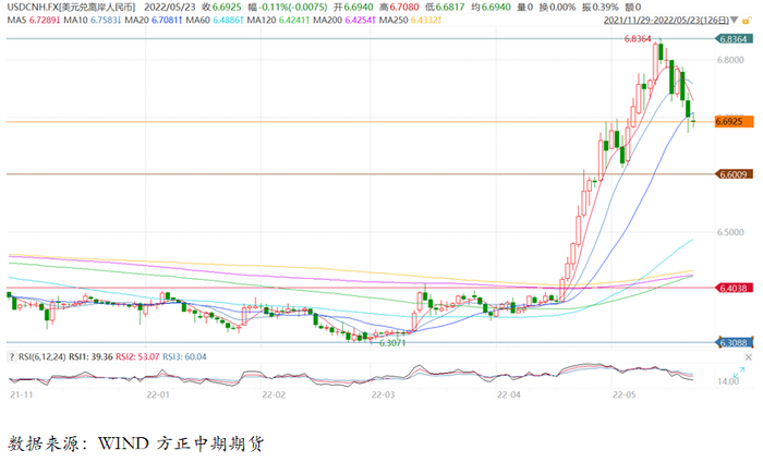 4月中旬以来,多重经济因素影响下,人民币持续贬值,美元/离岸人民币从6.38附近持续涨至最高的6.8364,涨幅达到7.15%。多重因素汇集使得人民币表现意外弱势:IMF大幅下调国内经济增速预期和局部疫情影响,经济下行风险加大;中美经济基本面和货币政策分化所造成的利差收窄甚至倒挂难以快速扭转,资本外流对人民币汇率形成较大压力;3月在俄罗斯央行等增持人民币做为外储情况下,汇率尚能维持紧平衡;而4月进出口或受疫情明显影响,贸易顺差回落的风险较大,给人民币带来贬值压力;美联储加速收紧货币政策,美元指数持续走强将使短期人民币承压。