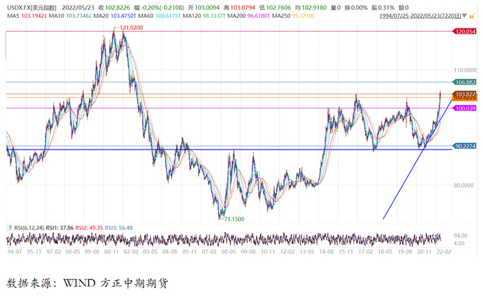 综上所述,美联储政策收紧被市场计价,在无额外鹰派表态前,美国经济前景黯淡对美元构成利空,欧元强劲拖累美元,美元指数将会维持高位偏弱运行态势,美指前期触及的105关口可能是近期顶部,即便是再度走强,也难以突破106.8-107强阻力位;美元指数2022年整体呈现前强后弱态势可能性大。美元指数下半年的弱势表现,将会直接利好贵金属行情,对贵金属整体走势形成利多影响。另外,美元指数走势,在一定程度上利好人民币,这将会使得内盘黄金表现不及外盘黄金,进而出现套利机会。