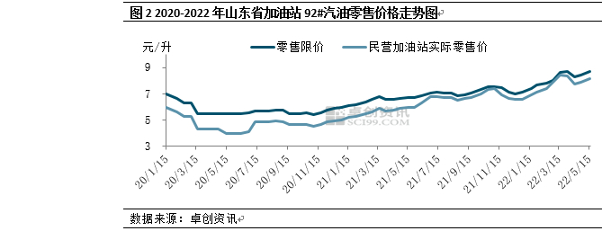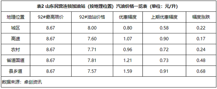 5月16日24时,发改委上调油价政策落实,卓创资讯监测山东省部分民营连锁加油站汽油实际零售均价,通过表1数据得出,山东省民营连锁加油站汽油优惠幅度较可观。