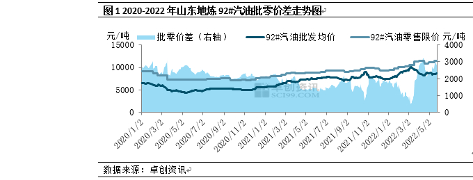 由图1数据显示,2022年以来山东地炼92#汽油批零价差整体呈现“V”型走势。据卓创资讯了解,随着3月上旬地炼汽油价格涨至高位,92#汽油批零价差降至年内最低点481元/吨。而3月中下旬开始,受制于需求疲弱、库存高位等因素,地炼汽油价格开启震荡下跌走势,相反的汽油零售限价随发改委多次上调政策落地而上涨,汽油批零价差明显扩大。