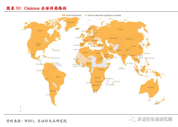 2021年11月9日,南非首次从病例样本中检测到一种新冠病毒B.1.1.529变异株。短短几周时间,该变异株即成为南非豪登省新冠感染病例的绝对优势变异株,增长迅猛。11月26日,WHO将其定义为第五种“关切变异株”(variant of concern,VOC),取名希腊字母Omicron(奥密克戎)变异株。奥密克戎变异株同时具有前4个VOC变异株刺突蛋白的重要氨基酸突变位点,包括增强细胞受体亲和力和病毒复制能力的突变位点。与此前的毒株相比,Omicron变异株传播力非常强,但致病力偏弱,感染所致的重症病例和死亡病例相对较少,而且现有疫苗仍然有效。