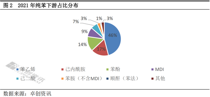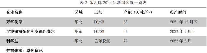 除了成本之外,本轮三苯价格强势上涨的背后,亦离不开供需结构的变化。提及供需结构,三苯2022年的变化也相当抢镜。首先纯苯来看,2022年下游投产高峰得以延续,进一步助推纯苯供需结构偏强整理。从图2来看,苯乙烯占纯苯下游46%,截至目前,苯乙烯行业新投产囊括了镇海炼化利安德巴赛尔、利华益及万华化学三套装置,合计203万吨。对纯苯的供需改善无疑起到了决定性作用。