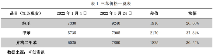 以江苏主港为例,截至5月24日收盘,纯苯9240元/吨,较年初上涨1910元/吨,涨幅26.06%;甲苯7905元/吨,较年初上涨2170元/吨,涨幅37.84%;二甲苯7800元/吨,较年初上涨1825元/吨,涨幅30.54%;目前市场价格均涨至近几年高位,并在尝试突破。