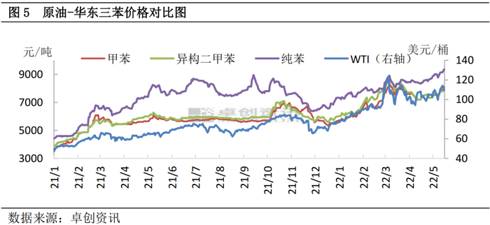 成本:国际油价不断上涨,三苯成本逐步增加的同时,也推动市场人士对后市的乐观信心。国际油价WTI价格自年初的77美元/桶涨至年内最高的123.7美元/桶,涨幅高达60.65%,布伦特原油价格一度突破130美元/桶高位,带动三苯成本端表现强劲,成本驱动带动市场人士操作积极性的提升, 基于市场人士对后市的乐观情绪拉动,市场交投活跃度增强,价格上涨。成本端的带动,在2-3月份原油快速拉涨过程中体现尤为明显。
