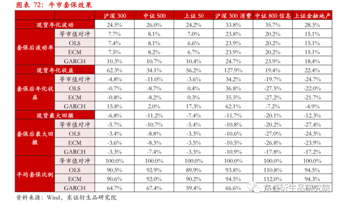 从降低波动率的角度看,牛市中依然是使用OLS法计算套保比例可以取得最好的套保效果;根据统计模型计算得到的套保比例偏低,而在牛市中较低的套保比例会在增加波动的同时提升组合收益,因此平均套保比例越低的模型,组合总体收益越高。