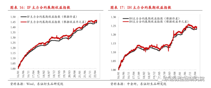 图表16-18以主力合约展期为例,以2016年1月4日为基准日,展示了根据新旧合约跨期价差率计算的展期收益指数,与根据期现收益率之差计算的展期收益指数的对比,可以看到两者的走势基本一致。