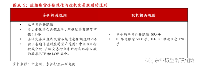 根据《中国金融期货交易所套期保值与套利交易管理办法》,套期保值与投机交易面临的交易限制是有区别的,主要体现在单日开仓限制与持仓总量限制两个方面。投机交易要求单合约单日开仓在500手以内,套期保值下单则没有相应的限制;投机交易对持仓量也有限制,IF单边持仓需在5000手以内,IC和IH单边持仓则需在1200手以内,套期保值的持仓限制则与持有现货市值有关。另外,卖出套期保值对应的资产范围包括:中证800指数成分股,沪深交易所上市的所有跟踪A股的股票ETF和LOF基金。这里需要注意的是,IF、IC、IH三个品种卖出套期保值资产范围限制是一致的。