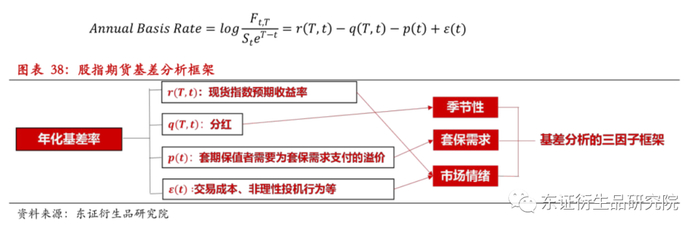 那么除了预期收益率、分红与套保需求,由市场非理性的投机行为导致的基差变动,我们统一将其归为市场情绪影响的范畴,以误差项表示,将定价公式稍作变形我们就得到了股指期货年化基差率的理论定价公式:
