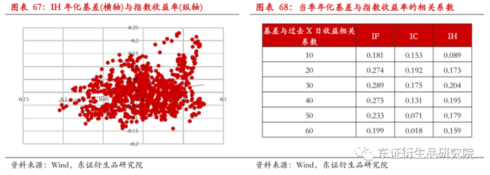 市场情绪决定了基差的短期波动。市场情绪变化引起的投机性交易往往导致股指期货基差与现货指数涨跌呈现明显的正相关关系。计算各品剔除分红的当季合约年化基差率与过去X个交易日的指数收益率的相关系数,X取值为10-60时两者都为正相关关系,其中IC基差与指数的正相关性较弱,主要是受到雪球对冲的影响。