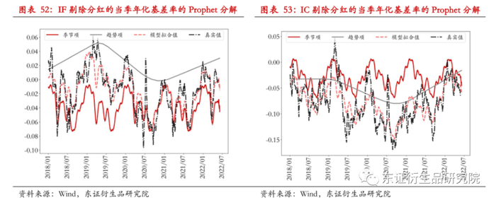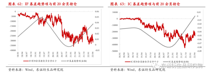 除此之外,交易所公布的前20会员的多空持仓也是观测套保需求的重要指标。前20会员持仓多空净头寸可以一定程度上表征持仓规模较大机构的持仓方向情况,该值从2019年以来一直深度负值,从数据角度印证了机构持仓以空头为主。可以看出前20会员持仓多空净头寸与Prophet模型分解出的趋势项呈一定的正相关关系。