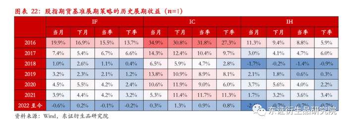 情形3:受季节性或套保需求的影响,基差在中长期内持续上行或持续下行。这种情形可以参考图表29与图表30的策略应对。历史上情形3的持续时间也比较长,基差下行趋势可以参考2019-2020年,受市场中性策略产品规模扩张的影响,股指期货基差持续走弱;基差上行趋势可以参考2021年下半年中证500股指期货的情形,这一阶段IC基差受雪球多头套保仓位的影响持续走强。基差具有非常明显的均值回复特征,因此在基差处于历史高位时,预期基差会有所走弱,基差处于历史低位时,预期基差会有所走强,因此在基差处于历史极端值时,更需密切关注合约切换的时机。