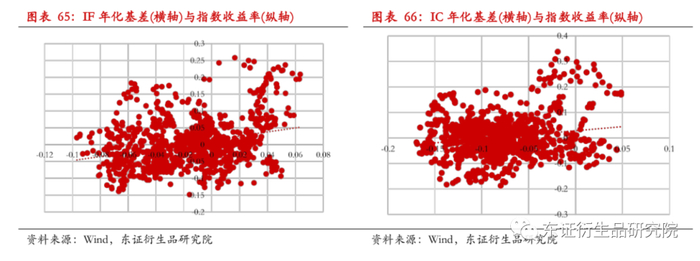 图表56-57展示了公募中性策略产品规模收益与IF基差之间的关系,公募中性策略产品的规模从2020年开始扩张,IF的基差也从2020年开始贴水明显扩大;21年开始随着中性策略收益的下降,产品规模开始缩量,尤其在2022年一季度产品规模与IF持仓规模几乎腰斩,已经开始接近2020年初的水平,IF基差在这段时间快速走强,剔除分红的当季合约年化基差处于升水状态。