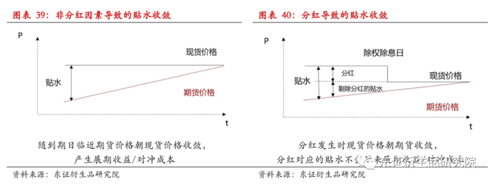 中证指数及上证指数的编制方法规定,当成分股分红时(在除息除权日),不会对指数做额外修正,而是让指数随成分股股价的除息除权而自然回落。由于期货交易的是对到期日价格的预期,合约到期日前的成分股分红会提前反映在基差的贴水中。分红发生后指数点位朝现货价格回落,如图表39和40所示,因此分红导致的股指期货贴水不会带来展期收益/成本。只有剔除分红导致的贴水后,基差率与年化基差率才能充分反映持有合约到期面临的展期收益/成本。因此在分析预测基差的变化趋势时,需要以剔除分红后的基差为准。