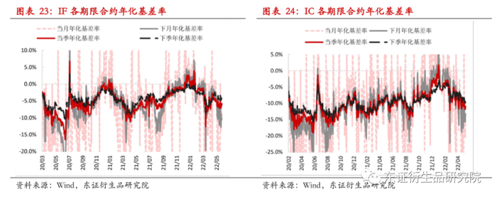 (3)中证500指数成分股风格偏向小盘成长,波动大于其余两个指数,因此潜在的alpha收益最高,中枢在20%左右,空头套保需求也是最旺盛的。小盘股风险与收益更高,符合私募的持仓偏好,私募量化对冲基金往往使用中证500股指期货对冲。