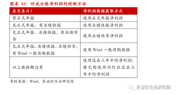 当成分股的分红预案公布完成,我们才能计算精确的分红预期;当成分股没有公布分红预案,由于分红的规律性较强,这时需要结合历史分红情况对分红情况做出预测,以计算股指期货包含的分红预期。对分红的预测主要包括三个方面:净利润、分红比例和分红日期。具体的计算方式可以参考图表42-44。