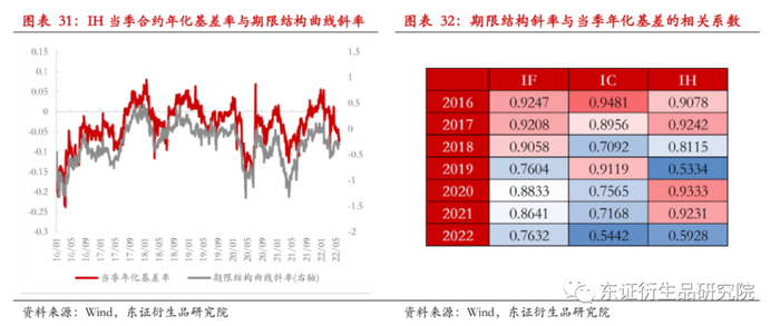 从数据验证的角度,我们可以用基差期限结构的斜率衡量价差的大小,斜率绝对值越大则价差越大。从图表26-28直接观测基差期限结构可以发现,基差走强贴水收窄,期限结构整体上移时,期限结构曲线也趋于平缓,价差收窄;而当基差走弱贴水走阔,期限结构整体下移时,期限结构曲线也趋于陡峭,价差走阔。我们以合约距到期日的交易日天数为自变量、基差点位为目标变量回归得到期限结构曲线的斜率,可以发现斜率与基差的走势高度正相关,相关系数高达0.9,如图表29-32所示。