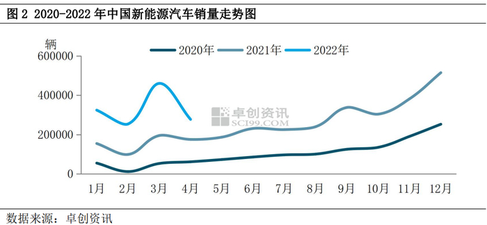 2022年1-2月份,中国新能源汽车销量数据虽环比下跌,但同比涨幅均较明显。3月份,新能源汽车销量明显好于行业,环比和同比继续保持快速增长势头。4月中国新能源汽车销量环比下跌,但仍好于去年同期。卓创资讯数据统计,3月中国新能源汽车销量46.04万辆,环比上涨81.47%,同比上涨136.34%;4月中国新能源汽车销量27.70万辆,环比下跌39.83%,同比上涨58.29%。据了解,4月份中国新能源汽车销量下降,与居民出行率不高有一定关系,亦与新能源汽车涨价有关。