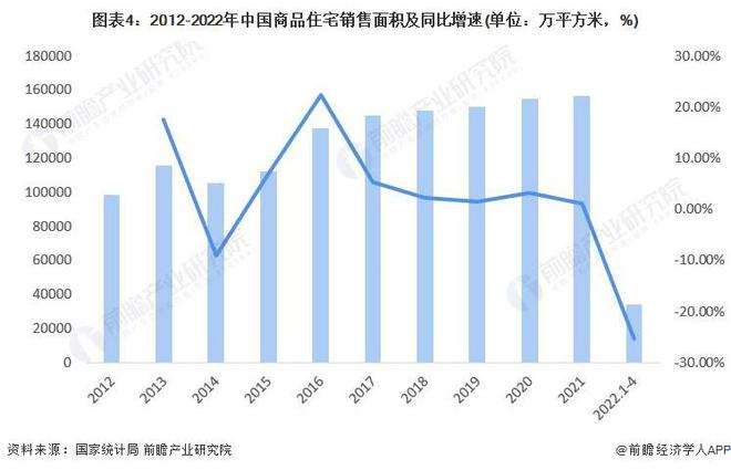 2022年1-4月,中国商品住宅销售面积达33722万平方千米,同比下降25.40%。