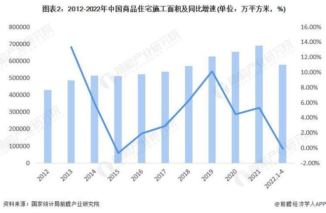 2022年1-4月,中国商品住宅施工面积为577692万平方米,同比下降0.10%。