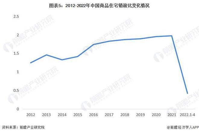 2012-2021年,中国商品房销竣比保持上升态势。2020年,中国商品房销竣比达到了1.98,同比增长1.07%。2022年1-4月,中国商品房销竣比仅为0.43,同比大幅下降84.38%。