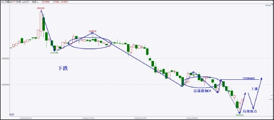 沪锡的下跌节奏保持良好,下跌-震荡不断交替出现,推动市场重心持续下移,空头趋势的力量不断释放。当下价格脱离最近的震荡徘徊区,从259940开始加速下跌,但今日价格在194110形成局部底分型拐点,表明价格暂时停止下跌,进入反弹上涨阶段。