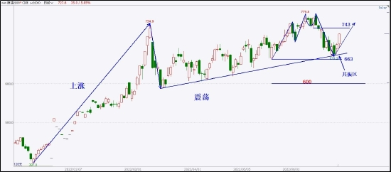 原油的支撑是很明显的,600元一桶是重要的市场心理关口。前期受俄乌战争对国际原油供给的影响,使得价格一路上涨至754元一桶,在俄乌战争前景没有十分明朗的前提下,价格想要再次回到600元以下,是得不到市场认可的。因此,如果价格后市测试600元附近的支撑区,是非常合适的买入机会。