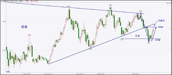 纯碱在漫长的震荡中度过了半年多的时间,最终在收口处,形成一个局部的U型小双顶,并破位颈线开始一波连续的下跌。虽然下行力度强劲,但并没有有效突破2700的左侧关键低点,来逆转走势结构。价格在2700附近形成一个小双底后,开始了连续的上攻。
