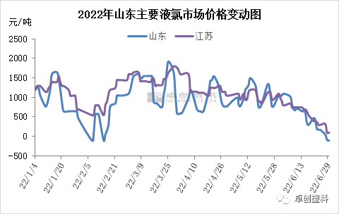 如图所示,以山东和江苏液氯市场价格为例,6月液氯市场价格逐步下滑,截至6月29日,山东液氯市场价格降至(-200)-1元/吨,江苏液氯市场价格降至1-200元/吨,山东液氯价格出现倒贴现象,下游需求疲软,下面我们具体看下部分下游产品本月的表现。
