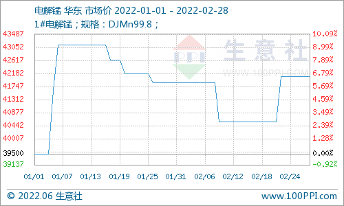 年初电解锰市场延续21年走势继续上涨,进入22年,电解锰厂家为期三个月的停产升级计划开始实施,绝大多数厂家出于停产状态,市场消息称22年整体停产计划实际将达半年左右,后市预期市场供应减少,厂家货源有限,报价不多,惜售心态较强,价格不断攀升。进入中旬后市场等待钢招指引,整体观望情绪较浓,市场价格暂稳运行。1月下旬后随着临近假期,市场商谈气氛较清淡,下游采购意向偏低,多数厂家已经进入假期,市场需求开始下滑,价格小幅下行。春节后多数厂家还是处于假期,市场报价较少,因厂家停产市场货源紧缺,整体交投有限,整个二月受假期影响较明显,走势偏震荡2月末市场主流价格在39000-39500元/吨,供需双方博弈心理较强。