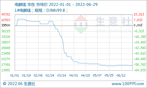 据生意社监测,2022年1月1日至6月30日华东地区1#电解锰市场价格大幅下调,年初均价在39500元/吨,年中均价在16650元/吨,跌57.85%。纵观电解锰华东市场2022年1-6月走势图,可以发现基本上行情分为三个阶段,第一阶段高位震荡盘整期,第二阶段快速下滑期,第三阶段跌后盘整期。
